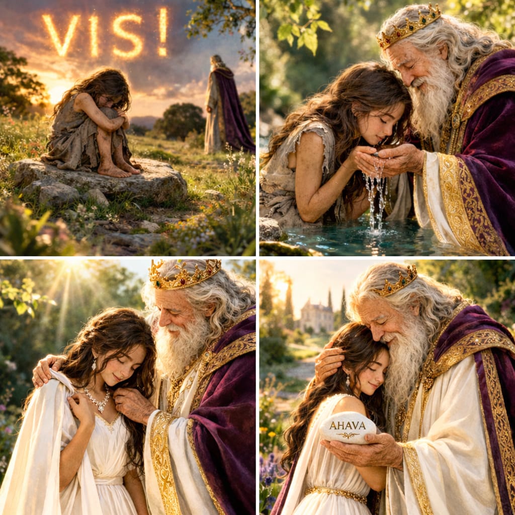 Le Roi la fit émerger de l’eau et la vêtit d’un blanc éclatant, doux et lumineux, comme tissé de lumière. Il la para de bijoux étincelants et posa sur elle un manteau royal, empreint de majesté et de protection. « Je t’ai couvert de lin fin… Je t’ai paré de beauté » (Ez 16, 10 et 13). La lumière des bijoux dansait sur sa peau, reflétant l’éclat nouveau de son cœur, et pour la première fois, elle se sentit entièrement vivante, libre et aimée.